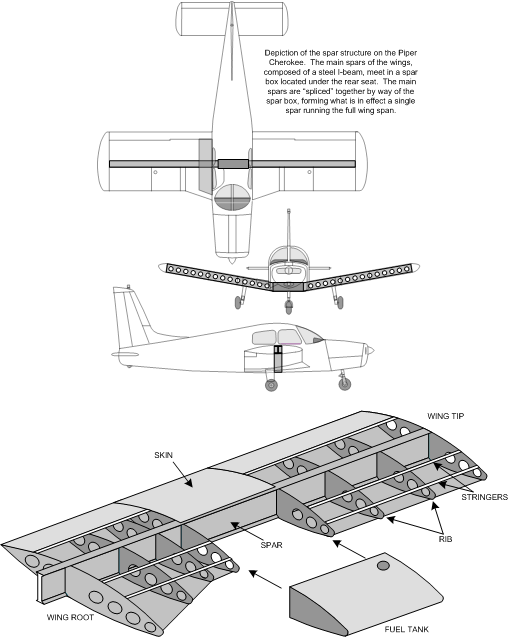 With respect to internal structure, wing loading is transmitted to the spar by way of ribs, which extend from the leading to trailing edge, intersecting the spar.