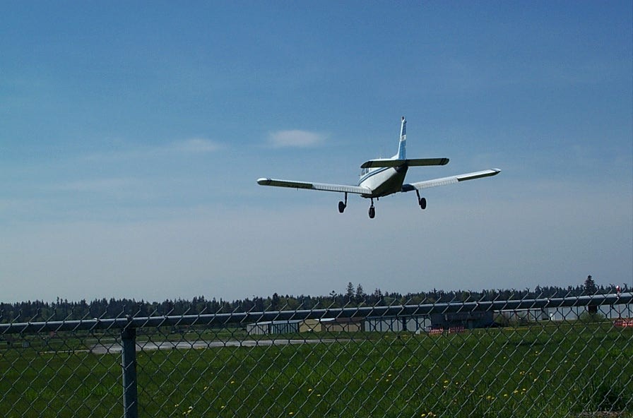 This approach and landing is quite similar to normal landings at Langley as we apply short field technique all the time in response to the limited length of our runways. Generally, attempt to target the start of the flare over the clear grassy area that precedes the edge of the runway pavement. The approach speed and flap setting is in accordance with the Pilot Operating Handbook. Despite the early flare, the landing is quite normal, except that the flaps are retracted and braking initiated as soon as the nose gear settles. Premature placement of nose gear on the runway raises the risk of wheelbarrowing and making ineffective use of aerodynamic braking. Do not “hammer” the brakes—this is dangerous and is hard on the airframe; instead, be firm but smooth with the brakes, being sure to maintain the aircraft precisely on the centreline.