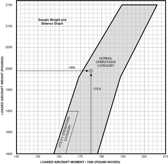In the above example we have used, the total moment was of course 175,615, a unit referred to as pound-inches. Since this figure is commonly large and cumbersome, the number is typically divided by 1000; so 175,615 lb-in. would become 175.615 lb-in/1000. (The unit names have the appearance of rocket science, but in fact it is all real simple stuff.) It is the 175.6 figure, along with the total weight of the aircraft (1995 lbs.), which is checked against graphs in the aircraft’s Pilot Operating Handbook. As show in the graph that appears below, the information presented is more or less identical to that which appears in the previous weight and balance graph.