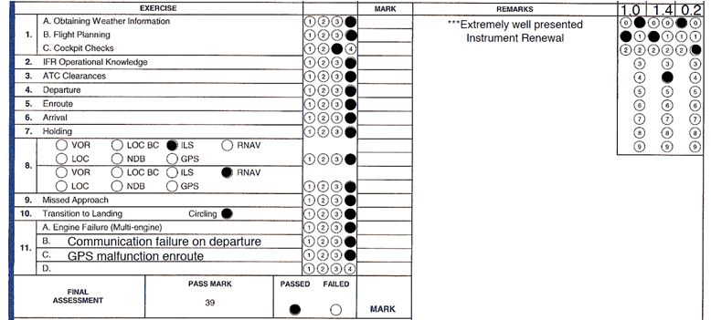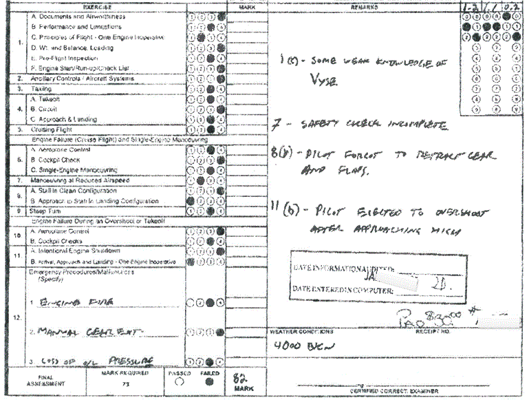 The collection of Flight Test Report samples below are derived from actual flight test results, so you will be reading raw Pilot Examiner notes. The idea, of course, is for you to read the comments of the examiner with the idea that you will know not to display in your own flight test. Unfortunately, the examiner comments are abridged and do not shed a lot of light on what occurred, but there should be enough information for you to get a sense of their general thinking leading to the mark-down. Remember that comments are only provided for scores of 2 or lower (i.e., 1). Therefore, when a candidate does well on an exercise, there will not be any more information other than the score of 3 or 4.