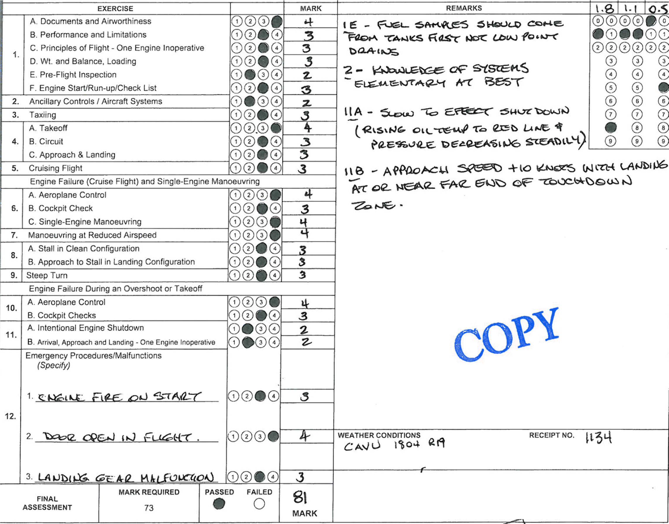 Learn from other students who have gone before you. This is the idea of this page. It is designed to ensure you know the common mistakes that have occured in the past. The idea is that if you are aware of these, you won't repeat them. This page is divided into two parts, the first is based on notes made by Flight Instructors following the debriefing that occurs after a flight test. The second part is comprised of the raw scanned Flight Test Reports (obviously excluding any information that might identify the student) so that you can read the actual comment recorded by the Pilot Examiner on the Flight Test Report that is submitted to Transport Canada.