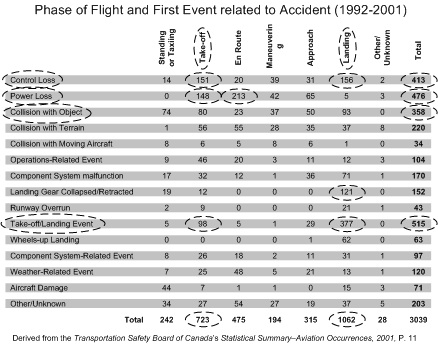 Above is also a table showing the cause of accidents that occurred between 1992 and 2001, relative to the phase of flight, and the first event that gave rise to the accident. The numbers further emphasize the increased exposure to risk associated with takeoffs and landings. Note that the landing risks are associated with events not associated with control or power loss, while these causes are prominent with takeoff accidents. With respect to en route causes, note the significant risk from power loss—be cautious with fuel planning, and be sure to stay current in forced-landing (power-off) skills.