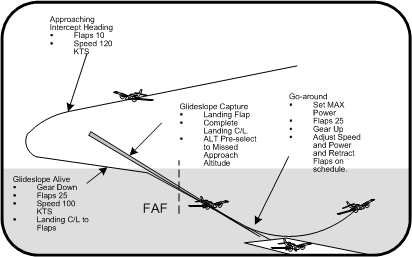 The vectored approach is the most elementary form of IFR approaches. This exercise focuses on the ILS and LOC Approaches. Students are introduced to the various phases and cockpit sequences associated with an approach clearance, including Approach Plate Briefings. In this exercise the simulator is flown down to the minimum published altitudes associated with instrument approaches—the Decision Height with respect to the ILS approach, and the MDA with respect to localiser approach, and students are introduced to published Missed Approach procedures. This exercise qualifies for accreditation. Operational Training Exercises: