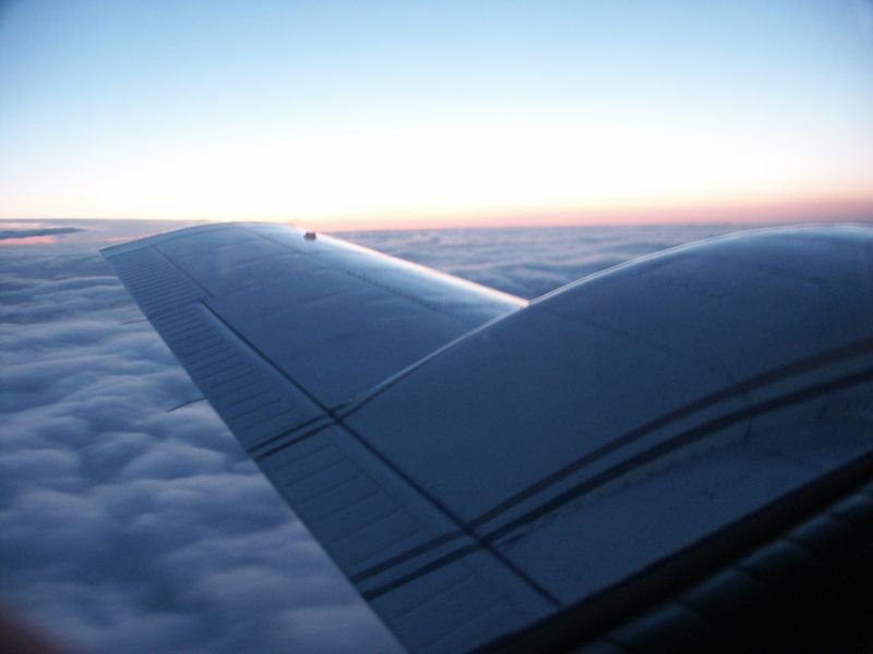 The left wing of Langley Flying School’s Piper Seneca over Oregon. March, 2005.