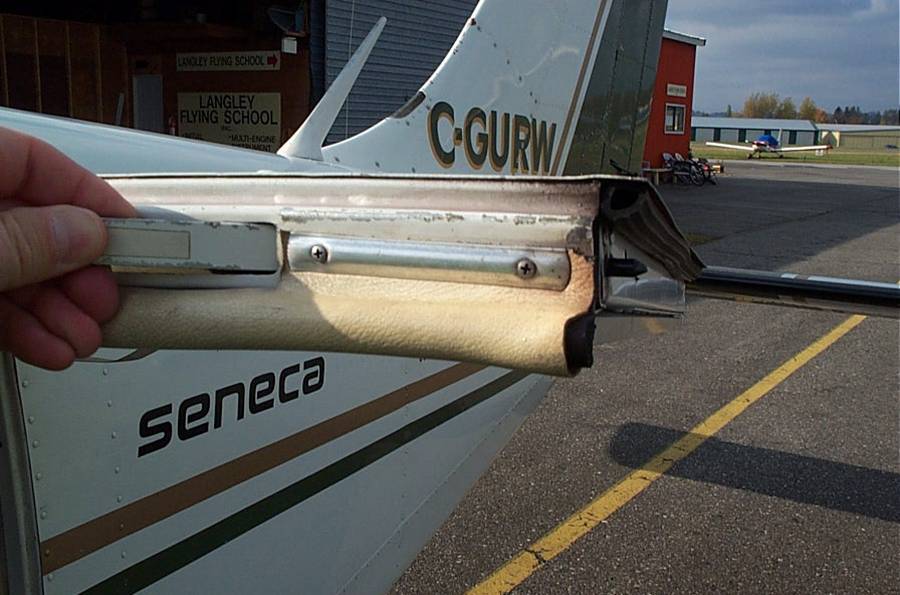 Proper ground handling of the aircraft is equally important. Many gear-up landings in the Seneca model have occurred as a result of over-extending the turning radius of the nose gear during ground movements—usually occurring when a tug (tractor) is used to tow the aircraft. The use of a tug whose pull-bar locks into the tow-bar rings on the side of the nose strut must be strictly forbidden. Fortunately, most tugs use a “plate” which slides under the nose wheel and physically raises the nose gear and allows it to rotate on the plate—with this machine the nose-gear strut itself is not torqued. Whenever using FBO services where movement of the aircraft might occur without your supervision, be sure ramp personnel are briefed on your requirements for safe towing.12 How nose-gear failures usually occur is that the strut has been strained beyond the 27°-arch permitted either side of centre.13 Over-extension beyond the permitted turning radius has the effect of derailing the gear from the track that is followed as the nose gear is retracted into the wheel well. Be sure, then, to get down and inspect the structure of the nose gear during the pre-flight inspection to be sure that damage has not occurred from ground handling.