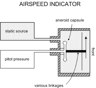 Connected to the static and pitot (dynamic) ports, the airspeed records the pressure difference (speed); each is measured by an expansion box referred to as an aneroid capsule.