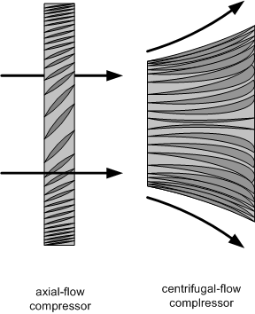 There are two types of compressor—the axial-flow compressor and the centrifugal-flow compressor. The axial compressor is shaped like a multi-bladed fan (referred to as rotor blades). Axial-flow compressors are the more efficient of the two, obtaining a compression ratio in excess of 25:1; this efficiency is derived primarily from the fact that the flow of air through axial-flow compressors essentially remains parallel to the longitudinal axis of the engine. Axial-flow compressors, however, are less durable than centrifugal-flow compressors as the rotor blades are vulnerable to impact with ingested material. In contrast, centrifugal-flow compressors essentially slingshot the air away from the longitudinal axis of the engine into what is referred to as the diffuser. The diffuser is positioned just before the combustor and serves the function of slowing the velocity of the airflow, yet simultaneously increasing its air pressure. The compression ratio of centrifugal-flow compressors is approximately 10:1.