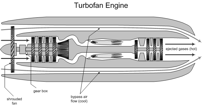 In the turbofan engine the shrouded fan is essentially a multi-blade propeller that is tightly fitted and enclosed in the front of the engine nacelle. The shrouded fan accelerates a much larger volume of air than a turbojet engine, a portion of which does not enter the engine core, but instead passes outside and around the core, to mix at the end of the engine with the hot gases that exit the turbines. The turbofan therefore produces bypass air which provides two important functions: firstly, the shrouded fan produces effective thrust, especially at low altitudes and airspeeds, and, secondly, the shrouded fan effectively muffles the ripping sound of the hot blast exiting the turbine core (turbofan engines are therefore much quieter than turbojet engines). A high-bypass turbofan engine is one in which the fan moves a much as four-times the volume of air that moves though the core engine; in contrast, with a low-bypass turbofan engine, the volume of air moving through the fan is approximately equal to the volume of air moving though the core engine.